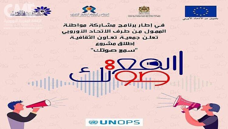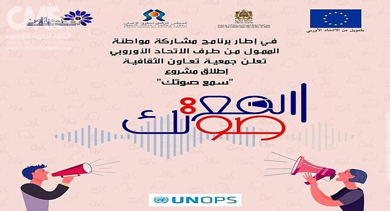 تستعد جمعية ” تعاون الثقافية “ بمدينة تطوان لإطلاق مشروعها الثقافي الجديد تحت شعار ” سمع صوتك “الذي سيتم انجازه بتمويل من الاتحاد الأوروبي وذلك في إطار برنامج مشاركة مواطنة، وبإشراف من مكتب الأمم المتحدة لخدمات المشاريع وبشراكة أيضا مع وزارة الدولة المكلفة بحقوق الإنسان والعلاقات مع البرلمان والمجتمع المدني والمجلس الوطني لحقوق الإنسان وبتعاون مع مركز “سبارطيل لخدمة القانون وحسن الأداء القضائي.”