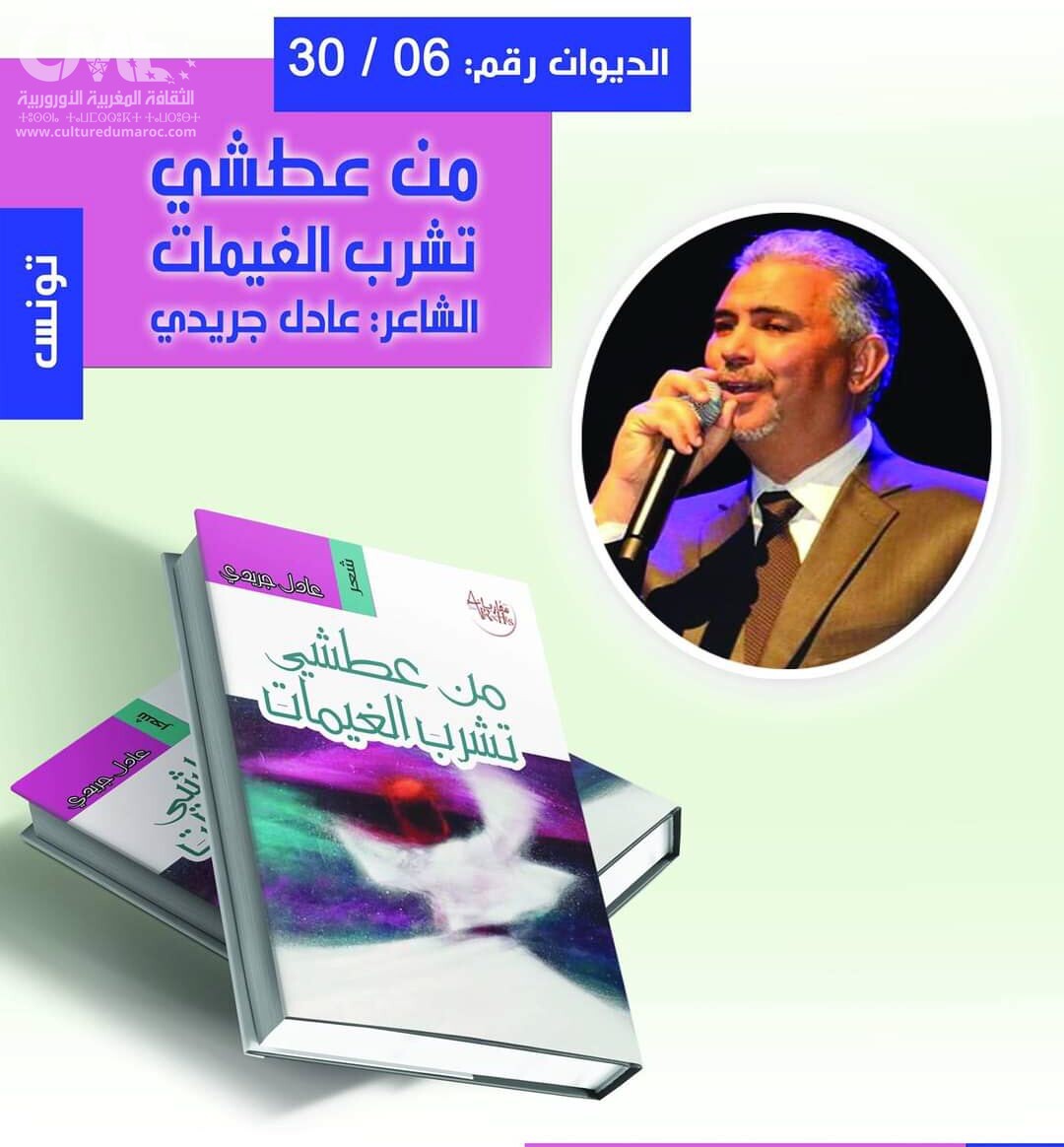 الديوان السادس من دواوين شهر الشعر الثلاثين. للشاعر التونسي عادل الجريدي بعنوان:” من عطشي تشرب الغيمات”