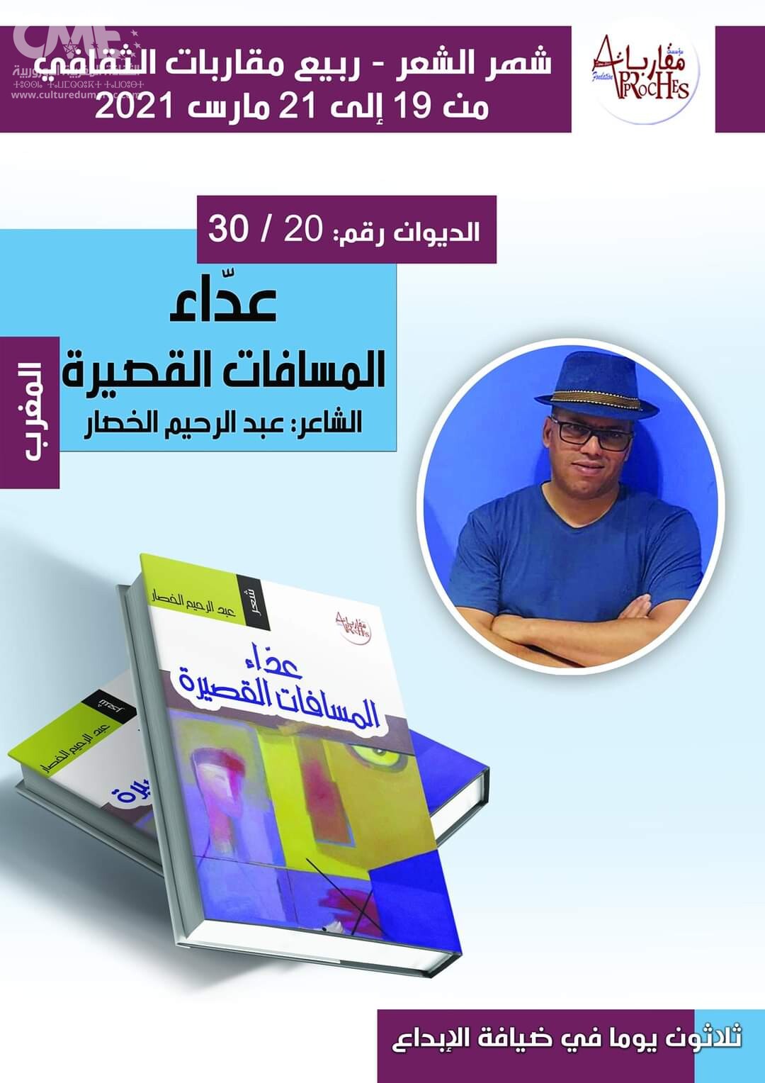 تنفيذا لمقترحها الإبداعي بنشر 30 ديوانا في شهر واحد من 19 فبراير الى 21 مارس 2021 تحت شعار : “لأن الشعر يستحق”، ضمن برنامج ربيع المؤسسة الثقافي 2021، أطلقت مؤسسة مقاربات العنوان الإبداعي العشرون للشاعر المغربي عبد الرحيم الخصار بعنوان:” عداء المسافات القصيرة ” ” لوحة الغلاف للفنان المبدع محمود الساجر.