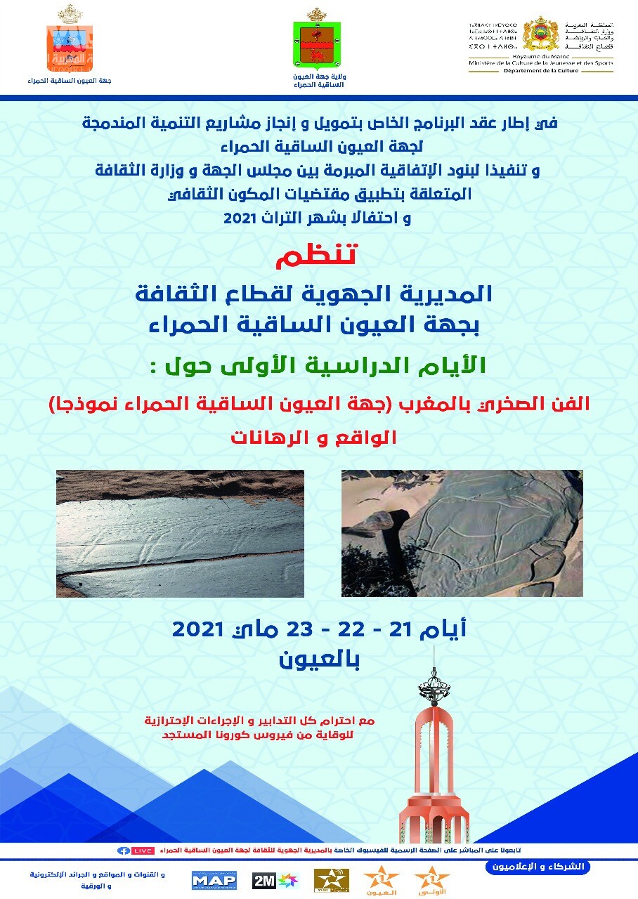 تواصل المديرية الجهوية لقطاع الثقافة بجهة العيون الساقية الحمراء برنامجها الثقافي والفني المكثف، وهكذا ستحتضن مدينة العيون ما بين 21 و23 ماي المقبل الأيام الدراسية الأولى حول “الفن الصخري بالمغرب (جهة العيون الساقية الحمراء نموذجا) الواقع والرهانات“، نظرا لما تزخر به الجهة وخاصة إقليم السمارة من مواقع للنقوش الصخرية هي موضوع أبحاث ودراسات أثرية بمشاركة خبراء مغاربة وأجانب بكل من موقعي لغشيوات والعصلي بوكرش، وستشمل الأبحاث والدراسات مواقع أخرى.