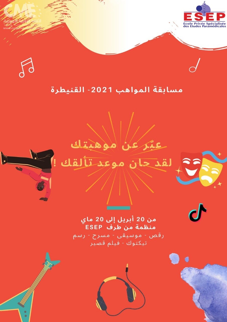 بمبادرة من الفاعل الثقافي الفنان محمد البدري والطبيبة الدكتورة مريم الكتاني وفي أول مبادرة تجمع بين قطاعي الثقافة والصحة تنظم المدرسة المختصة في القطاعات الشبه الطبية بمدينة القنيطرة في اطار الاحترازات الصحية التي فرضتها جائحة كورونا ، مسابقة كبرى عن بعد لإبداعات الشباب في عدة مجالات فنية في الفترة ما بين 20 أبريل و 20 ماي 2021 تحت شعار ” ابداعات شبابية لمغرب ما بعد جائحة كورونا “
