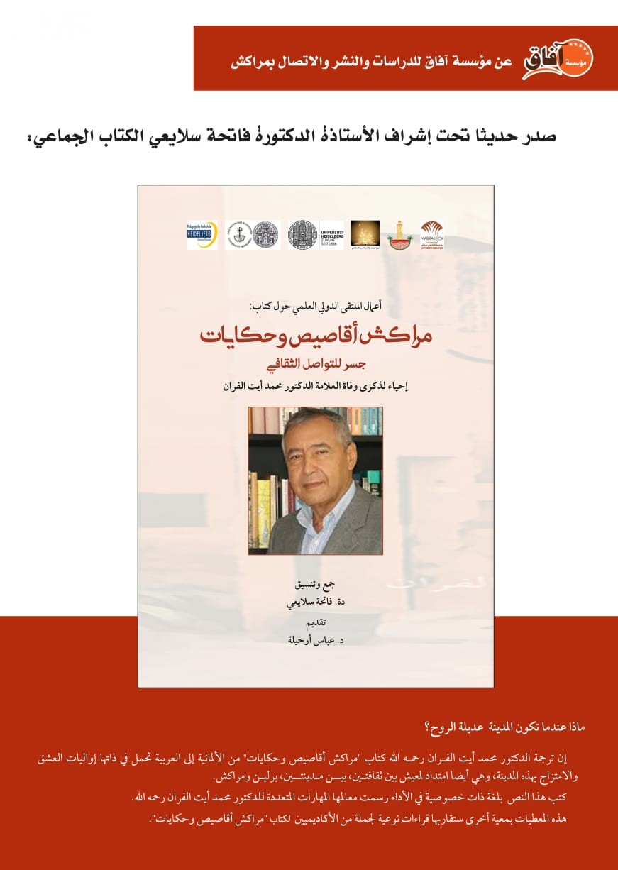 عملت أشغال الملتقى الدولي العلمي بإصدار كتاب “مراكش أقاصيص وحكايات” للبروفيسور الطبيب الجراح الألماني المغربي الأصل خالد سهولي في كتاب بإخراج أنيق أخاذ يحمل العنوان نفسه الذي وُسِم به الكتاب الترجمة المحتفى بها وصاحبها الفقيد الدكتور محمد أيت الفران رحمة الله عليه. وقد انعقد الملتقى في الثالث من ماي 2019م بإشراف بنية البحث في أدب الغرب الإسلامي بكلية اللغة العربية بمراكش.
