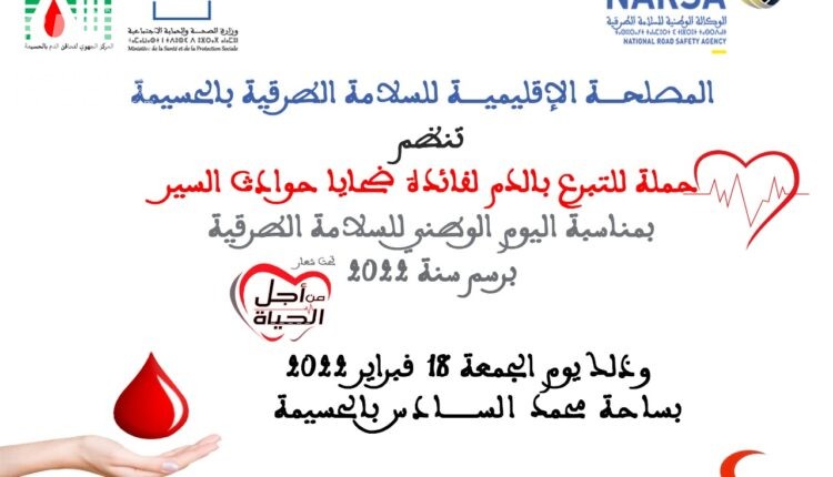 بمناسبة الاحتفال باليوم الوطني للسلامة الطرقية الذي يصادف 18 فبراير من كل سنة بالمغرب، و تحت شعار “من اجل الحياة” ـ تعتزم المصلحة الاقليمية للسلامة الطرقية بالحسيمة تنظيم حملة موسعة للتبرع بالدم لفائدة ضحايا حوادث السير ، و ذلك طيلة يوم الجمعة 18 فبراير 2022 بساحة محمد السادس بمدينة الحسيمة.