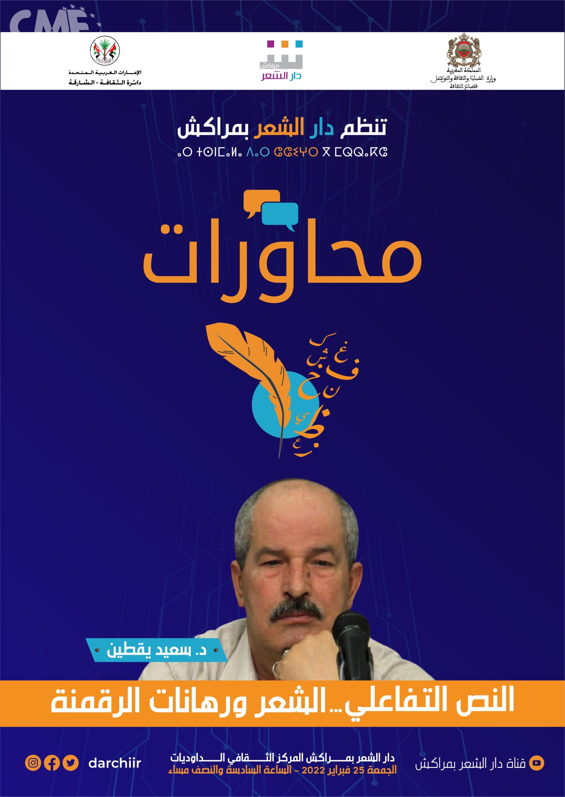 اختارت دار الشعر بمراكش، ضمن برمجتها الشعرية والثقافية للموسم الجديد، أن تنظم تظاهرة شعرية ونقدية ومعرفية جديدة ضمن فقرة ندوات وسمتها ب”محاورات”. الأكاديمي والناقد سعيد يقطين يفتتح هذه اللحظة المعرفية، في محطتها الأولى، بمقر دار الشعر مراكش (الكائن بالمركز الثقافي الداوديات) الجمعة 25 فبراير 2022 على الساعة السادسة والنصف مساء. واختارت الدار أن يكون محور اللقاء “النص التفاعلي.. الشعر ورهانات الرقمنة”، ضمن فقرة ندوات، والتي حرصت دار الشعر بمراكش أن تستقصي من خلالها قضايا وأسئلة تتعلق براهن الخطاب الشعري، وتعالقات الشعري والجمالي والرقمي.