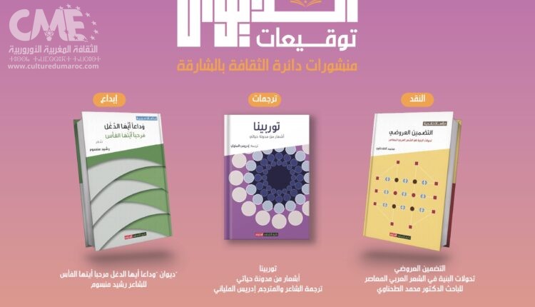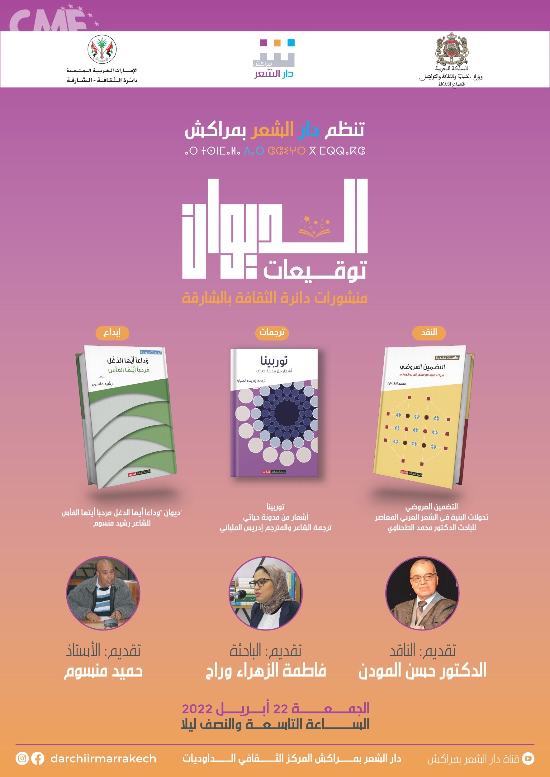 ضمن التعاون الثقافي المشترك بين وزارة الشباب والثقافة والتواصل بالمملكة المغربية ودائرة الثقافة بحكومة الشارقة دولة الامارات العربية المتحدة، تنظم دار الشعر بمراكش، احتفاء باليوم العالمي للكتاب وحقوق المؤلف، فقرة جديدة موسومة ب”الديوان” ضمن برنامج “توقيعات” وذلك يوم الجمعة 22 أبريل الجاري على الساعة التاسعة والنصف ليلا بمقر الدار الكائن بالمركز الثقافي الداوديات، احتفاء بإصدارات جديدة لشعراء ونقاد ومترجمين مغاربة. وتنتظم هذه الفقرة الجديدة في دورة أولى، على أن تتواصل شهر يونيو القادم احتفاء بعناوين صدرت ضمن منشورات دائرة الثقافة بالشارقة.