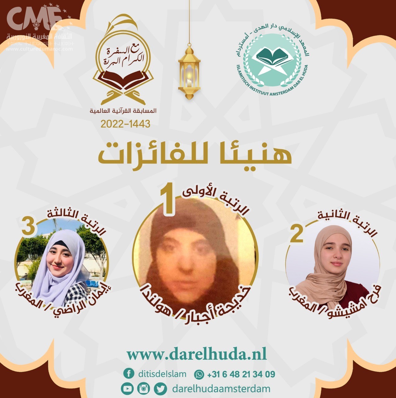 اختتمت المسابقة القرآنية العالمية ”مع السفرة الكرام البررة “في نسختها الثالثة مساء الثلاثاء 2 شوال 1443 هـ الموافق 3 ماي 2022م ، والتي نظمها المعهد الإسلامي دار الهدى بأمستردام. خلال شهر رمضان المبارك لهذا العام بمشاركة 1055 متسابقاً ومتسابقة يمثلون 63 دولة، يتنافسون في تجويد وترتيل الذكر الحكيم.