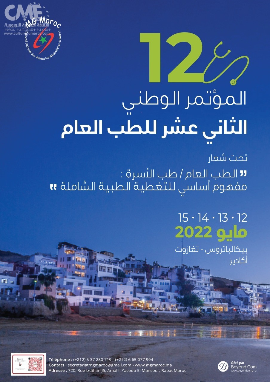 تحت الرعاية السامية لصاحب الجلالة الملك محمد السادس نصره الله، تنظم الجمعية الوطنية لأطباء الطب العام بالمغرب (MG MAROC) مؤتمرها الثاني عشر للطب العام أيام 12، 13، 14، 15 ماي الجاري ببيكالباتروس تغازوت بأكادير، وذلك تحت شعار “الطب العام/ طب الأسرة: مفهوم أساسي للتغطية الصحية الشاملة”.