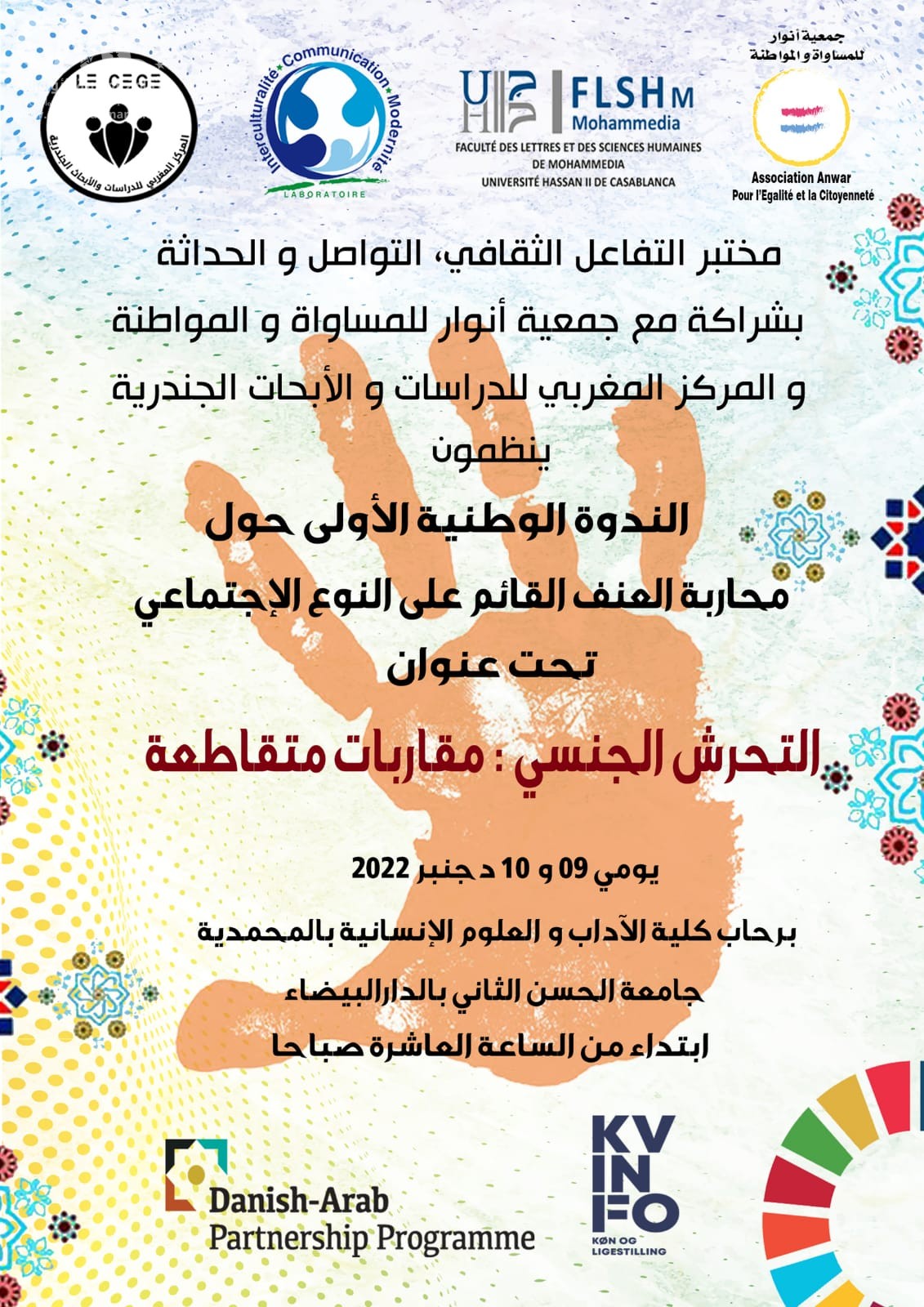 “التحرش الجنسي : مقاربات متقاطعة”هو موضوع الندوة الوطنية التي تنظمها جمعية أنوار للمساواة والمواطنة ومختبر الأبحاث: “التواصل الثقافي والتواصل والحداثة” المعتمد في جامعة الحسن الثاني بالدار البيضاء والمركز المغربي للدراسات والبحوث الجندرية، يومي 9 و10 نوفمبر 2022 بكلية الآداب والعلوم الإنسانية بالمحمدية، بشراكة مع المركز الدنماركي لبحوث النوع الاجتماعي (كفينفو)، وتنسقان أشغالها نجاة النرسي ومنى الشماخ.