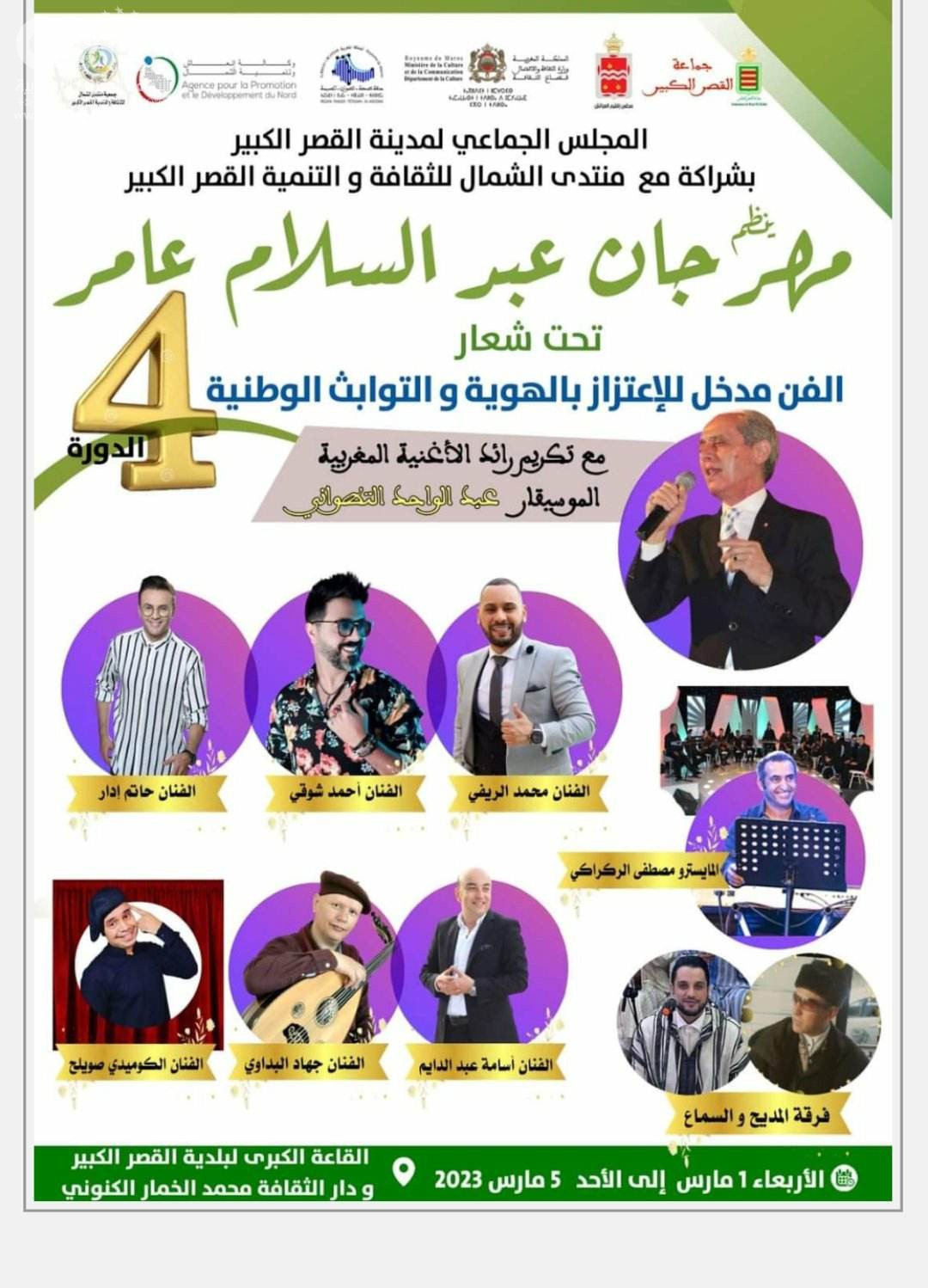 (( تعرف مدينة القصر الكبير في الفترة الممتدة من فاتح مارس 2023 إلى غاية الأحد 5 مارس الجاري ، فعاليات النسخة الرابعة من مهرجان عبد السلام عامر، تحت شعار: ” الفن مدخل للاعتزاز بالهوية والتوابث الوطنية ” من تنظيم المجلس الجماعي لمدينة القصر الكبير ، بشراكة مع منتدى الشمال للثقافة والتنمية بنفس المدية ، ودعم من وزارة الثقافة والمجلس الإقليمي للعرائش ، ومجلس جهة طنجة تطوان الحسيمة ، ووكالة إنعاش وتنمية الشمال .