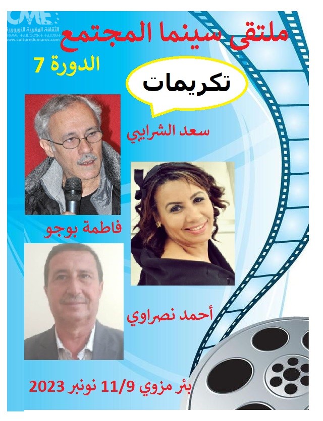 تكرم فعاليات الدورة السابعة لفعاليات ملتقى سينما المجتمع، التي تنظمها جمعية الشروق ببئر مزوي إقليم خريبكة، من 9 الى 11 نونبر 2023، ثلاثة أسماء، تقديرا لجهودها القيمة والرفيعة، في المجال الفني والسينمائي والمجتمعي.