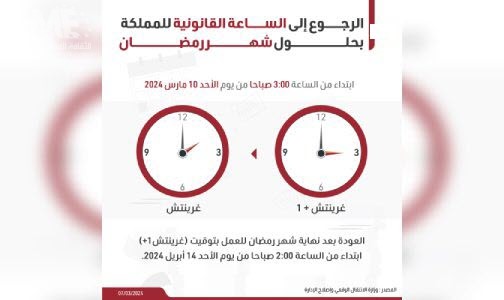 وأضاف المصدر ذاته أنه سيتم، بعد نهاية شهر رمضان، إضافة ستين (60) دقيقة إلى الساعة القانونية عند حلول الساعة الثانية صباحا من يوم الأحد 14 أبريل 2024.