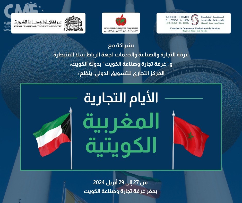 تحت شعار “من المغرب إلى الكويت، نحو شراكة اقتصادية متينة” ، تنعقد خلال الفترة الممتدة بين 27 و 29 أبريل 2024، فعاليات الأيام التجارية المغربية – الكويتية، وذلك بمقر غرفة تجارة وصناعة الكويت في دولة الكويت.