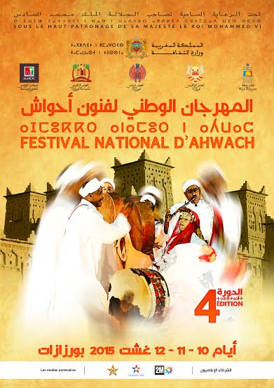 تح الرعاية الملكية السامية لصاحب الجلالة الملك محمد السادس نصره الله، وفي إطار العناية بالتراث الثقافي غير المادي والسعي المتواصل لتوفير سبل التعريف به والمحافظة علية وتثمينه، تنظم وزارة الثقافة بشراكة مع المجلس الإقليمي للسياحة لورزازات، والمكتب الوطني المغربي للسياحة، ومجلس عمالة ورزازات ومجلس جهة سوس ماسة درعة والمجلس البلدي لورزازات، الدورة الرابعة للمهرجان الوطني لفنون أحواش من 10 إلى 12 غشت 2015 بمدينة ورزازات.