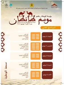 ويتضمن برنامج هذه الدورة فقرات متنوعة وغنية، تجسد تجربة ثرية للثقافة البدوية، من خلال عروض تقليدية جذابة، وإقامة معارض للحرف اليدوية الأصيلة، وتنظيم التبوريدة، وسباقات الإبل، إضافة إلى معارض تراثية على مدار أيام الموسم لإبراز التراث الحي الذي تزخر به المنطقة.