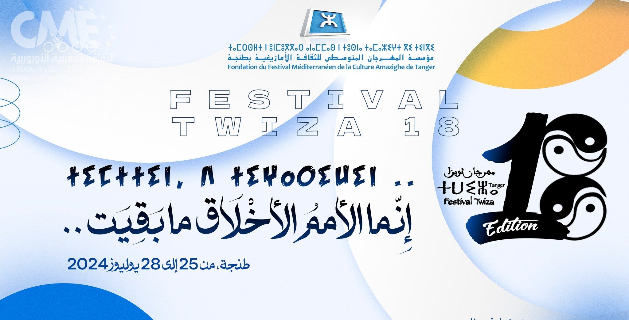 تنظم “مؤسسة المهرجان المتوسطي للثقافة الأمازيغية بطنجة” الدورة 18 من “مهرجان ثويزا”، من يوم الخميس 25 إلى يوم الأحد 28 يوليوز 2024، تحت شعار: “إنما الأمم الأخلاق..”.