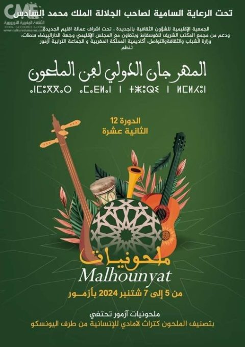تحت الرعایة السامیة لصاحب الجلالة الملك محمد السادس الجمعیة الإقلیمیة للشؤون الثقافیة بالجدیدة ، تحت اشراف عمالة اقلیم الجدیدة وبدعم من مجمع المکتب الشریف للفوسفاط وبتعاون مع المجلس الإقلیمي و جهة الدارالبیضاء سطات، أکادیمیة المملکة المغربیة ، وزارة الشباب و الثقافة و التواصل و الجماعة الترابیة آزمور تنظم الدورة الثانیة عشرة للمهرجان الدولي لفن الملحون و ذلك من 5 إلى 7 شتنبر 2024 بآزمور .