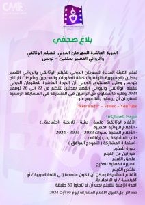 تعلم الهيئة المديرة لتنظيم المهرجان الدولي للفيلم الوثائقي والروائي القصير بمدنين أن الدورة العاشرة التي ستنعقد من 22 الى 26 نوفمبر 2024 بمدنين – تونس، تفتح باب الترشح للمشاركة في المسابقة الرسمية للأفلام الى غاية 30 اوت 2024.