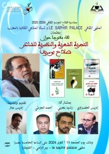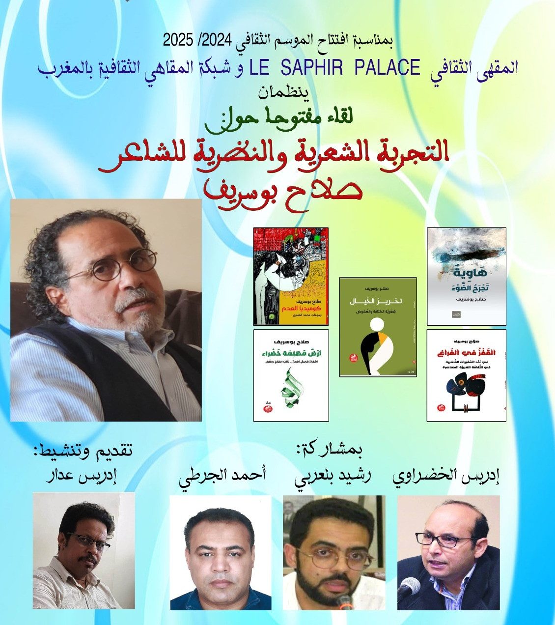 بمناسبة إفتتاح الموسم الثقافي 2024/2025 لشبكة المقاهي الثقافية بالمغرب ، يحتضن المقهى الثقافي ” ” لوسافير بلاص ” لقاء مفتوحا حول التجربة الشعرية والنظرية للشاعر صلاح بوسريف ، وذلك يوم الجمعة 11 أكتوبر 2024 بمقهى le saphir palace بير الرامي بمدينة القنيطرة على الساعة الخامسة عصرا .