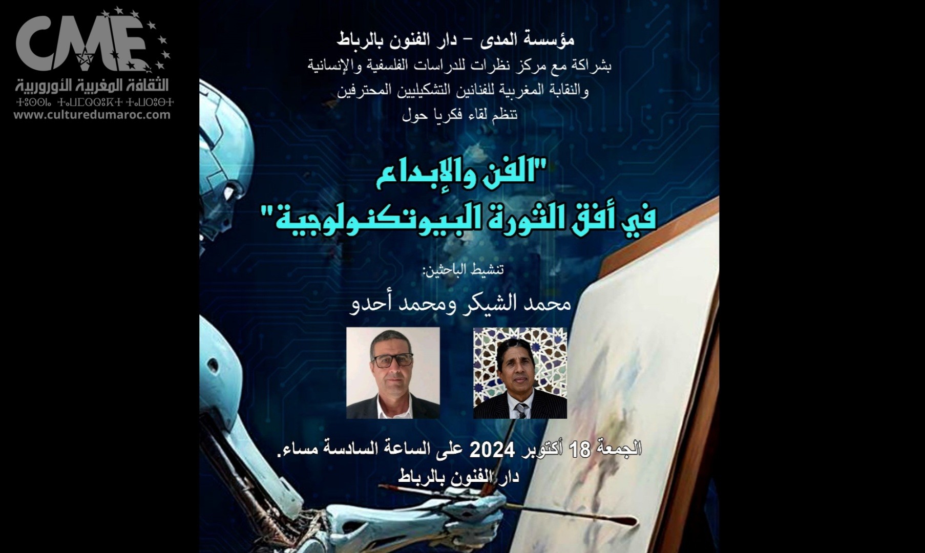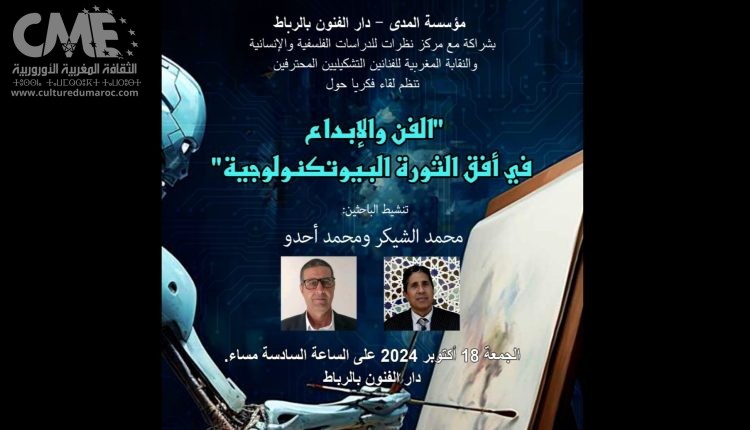” الفن والإبداع في أفق الثورة البيوتكنولوجيK “ينشطه الباحثان محمد الشيكر ومحمد أحدو، وذلك يوم الجمعة 18 اكتوبر 2024، بدار الفنون على الساعة السادسة مساء.
