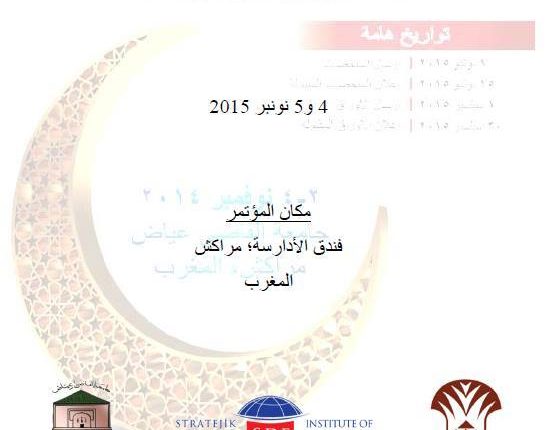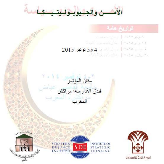 ينظم معهد التفكير الاستراتيجي بتركيا بشراكة مع مجموعة الأبحاث والدراسات الدولية حول إدارة الأزمات التابعة لكلية الحقوق؛ بجامعة القاضي عياض؛ المؤتمر العربي- التركي الخامس للعلوم الاجتماعية؛ في دورته الخامسة بمدينة مراكش يومي 4 و5 نونبر 2015؛ في موضوع الأمن والجيوبوليتيكا.