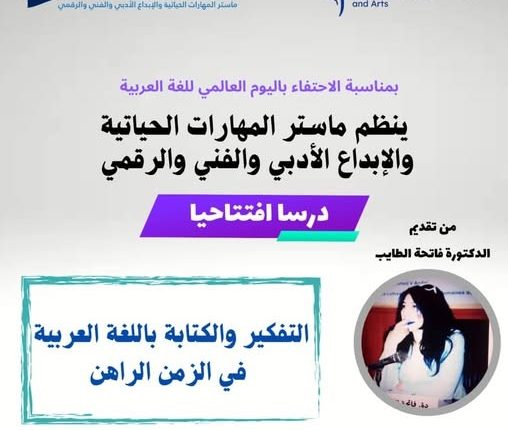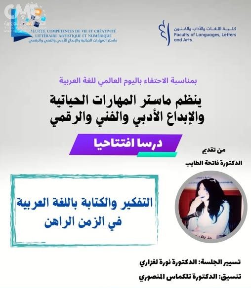 بمناسبة اليوم العالمي للغة العربية، ينظم ماستر المهارات الحياتية والإبداع الأدبي والفني والرقمي درساً افتتاحياً تحت إشراف منسقة الماستر الدكتورة تلكماس المنصوري، تقدمه الدكتورة فاتحة الطايب بعنوان “التفكير والكتابة باللغة العربية في الزمن الراهن”.