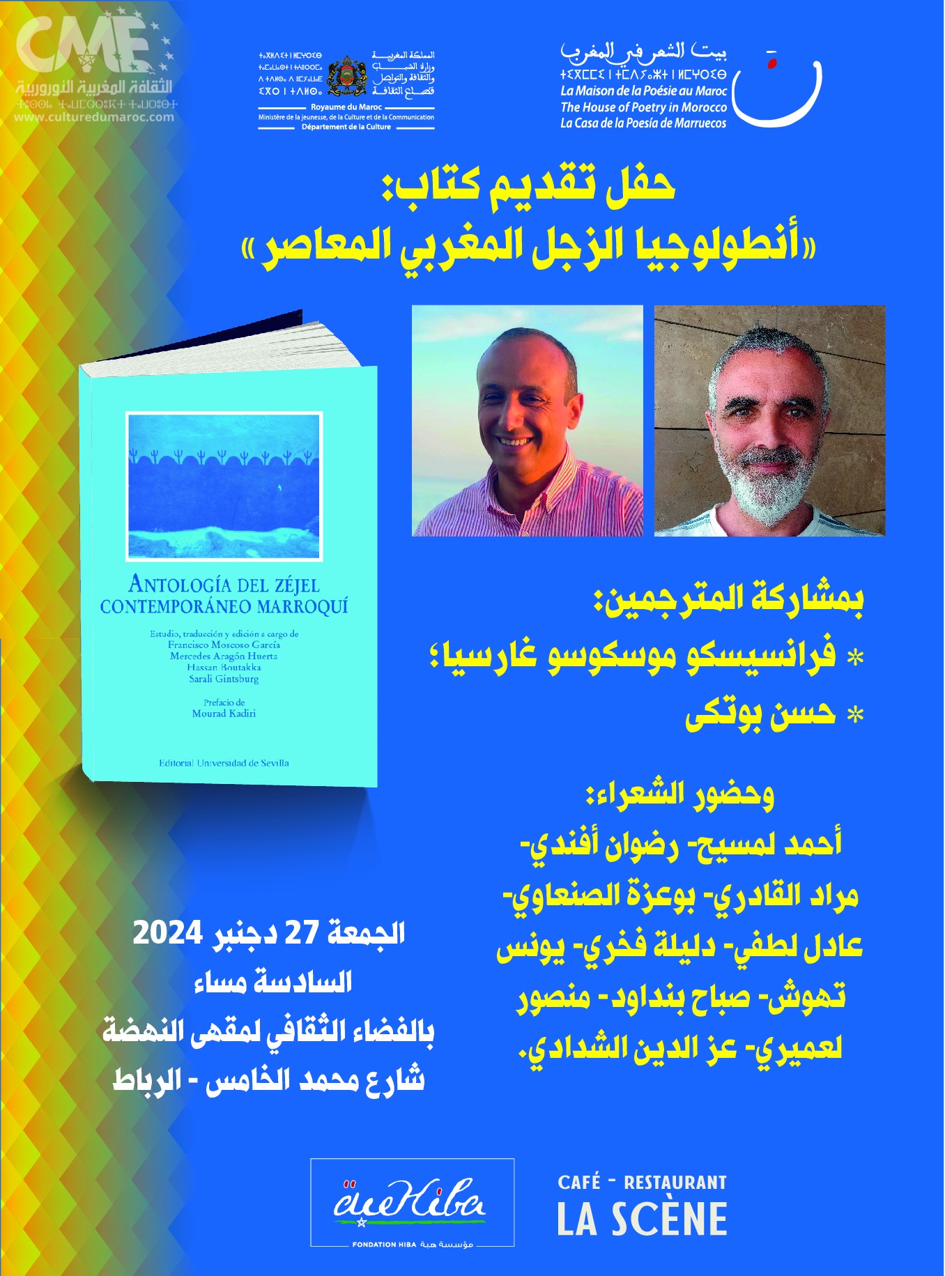 ينظّم بيت الشعر في المغرب والفضاء الثقافي لمقهى سينما النهضة بالرباط لقاء ثقافيا وشعريا لتقديم” أنطولوجيا الزجل المغربي المعاصر”الصادرة مؤخرا عن منشورات جامعة اشبيلية بإسبانيا والتي أنجزها الأساتذة: فرانسيسكو موسكوسو غارسيا، ميرسيديس أرغون هويرتا، حسن بوتكى، وسارة لي جيتنسبورغ.