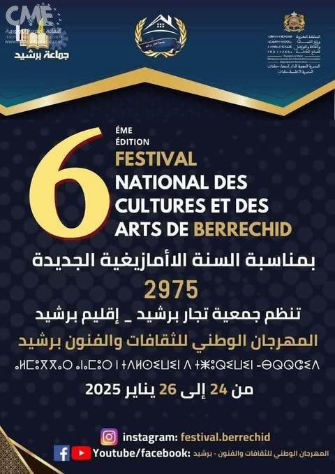 تنظم جمعية تجار برشيد- اقليم برشيد النسخة السادسة من المهرجان الوطني للثقافات والفنون بمدينة برشيد وذلك بدعم من مجموعة من المؤسسات الخاصة والعمومية وبشراكة مع وزارة الشباب والثقافة والتواصل- قطاع الثقافة والمجلس الجماعي لمدينة برشيد، وذلك من 24 الى 26 يناير 2025 بمدينة برشيد، ويأتي هذا المهرجان بمناسبة حلول السنة الامازيغية الجديدة 2975، والذي سيعرف حضور مجموعة من الشخصيات الفنية البارزة في عالم الفن والثقافة على المستوى الوطني والمحلي إضافة إلى تنظيم مجموعة من الفقرات المتنوعة لفائدة الحاضرين وكذا لفائدة الأطفال.