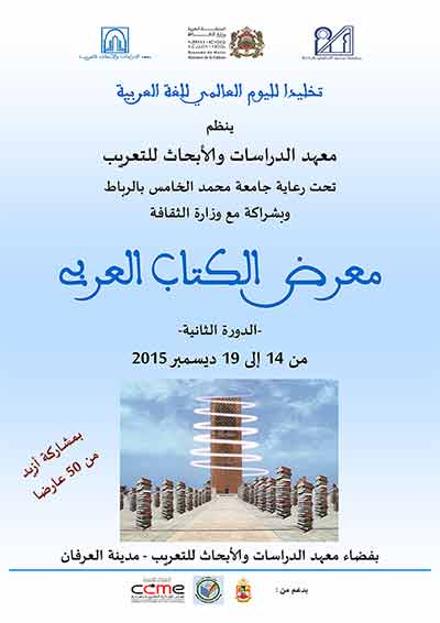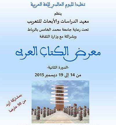 تخليداً لليوم العالمي للغة العربية الذي يصادف يوم ثامن عشر ديسمبر من كل سنة، ينظم معهد الدراسات والأبحاث للتعريب تحت رعاية جامعة محمد الخامس بالرباط وبشراكة مع وزارة الثقافة ودعم من مجلس الجالية المغربية بالخارج، ومجلس مدينة الرباط، ومقاطعة أكدال الرياض، الدورة الثانية لمعرض الكتاب العربي وذلك من 14 إلى 19 ديسمبر 2015.