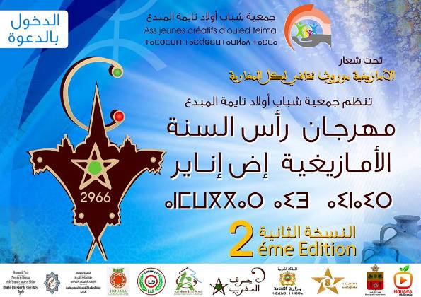من المنتظر أن تنظم جمعية شباب اولاد تايمة المبدع بمناسبة الاحتفال برأس السنة الامازيغية 2966 أمسية احتفالية بالمركب الثقافي لمدينة اولاد تايمة تحت شعار “الامازيغية موروث ثقافي لكل المغاربة” وذلك يوم السبت 23 يناير 2016 ، ابتداءً من الساعة الثالثة بعد الزوال. هذه الامسية التي سيحضرها ثلة من الفنانين والاعلامين الأمازيغين والأساتذة الباحثين في الثقافة الامازيغية، بالاضافة الى عدد من فعاليات المجتمع المدني والتي ستعرف تكريم بعض الشخصيات التي أعطت للثقافة الامازيغية الشيء الكثير مثل الاستاذة الباحثة ليلى الرهوني بالاضافة الى الفنان الامازيغي احمد بردوز والفاعل الجمعوي ميلود الكميري بالاضافة محمد الروميات . كما ستعرف هذه الأمسية تقديم مجموعة من المداخلات التي تلامس القضية الامازيغة بدءاً بمداخلة السيد مراد الناشف حول بعض الشخصيات الامازيغية عبر التاريخ ثم ورقة ميلود ازرهون حول اهمية الثقافة الامازيغية في التنمية البشرية بالاضافة الى مذاخلة الاستاذ الباحث خالد ألعيوض واخيرا ورقة الباحث سيدي احمد الهيبة حول ارتباط الثقافتين الحسانية و الامازيغية اما بخصوص الجانب الفني فستتخلل الأمسية لوحات فنية فكلورية واخرى مسرحية وشعرية من تقديم مجموعة من الفرق المحلية والجهوية. بالاضافة الى استقبال الحضور الكرام بمجموعة من الاطباق التي ترتبط بالثقافة الامازيغة والتنوع الثقافي المغربي وفي النهاية سيتم تقديم شواهد تقديرية على المساهمين في انجاح الحفل في نسخته الثانية .