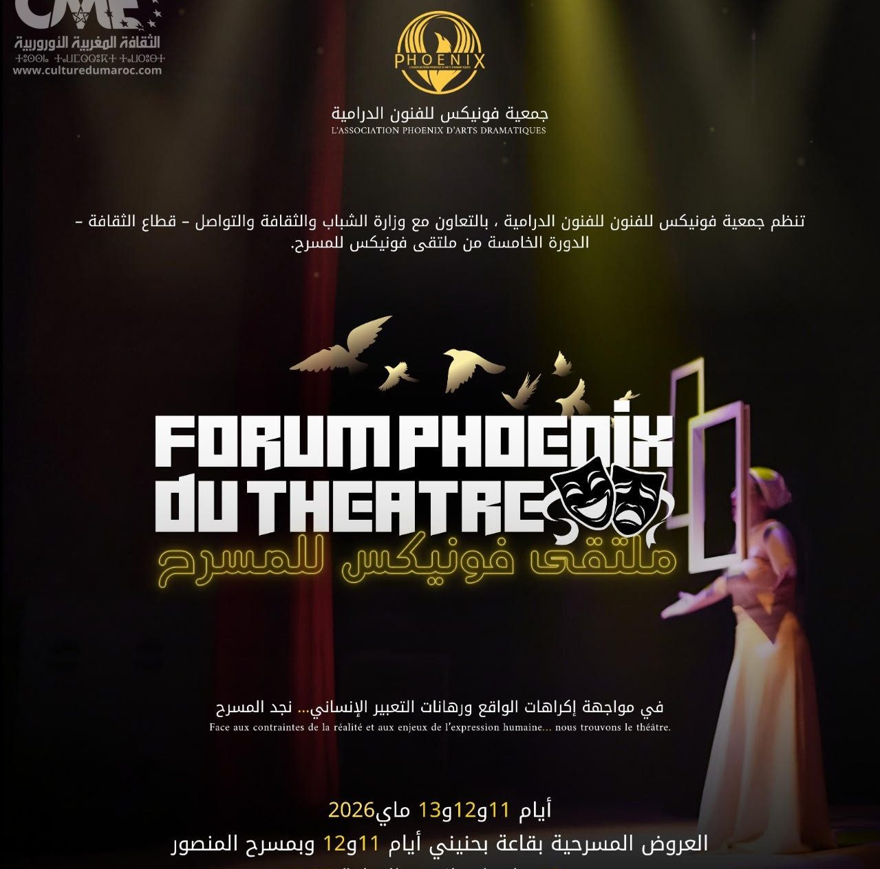 تحتضن مدينة الرباط، ايام 11و12 و13 ماي 2026، الدورة الخامسة لملتقى فونيكس للمسرح، الذي تنظمه جمعية فونيكس للفنون الدرامية بالتعاون مع وزارة الشباب والثقافة والتواصل – قطاع الثقافة.