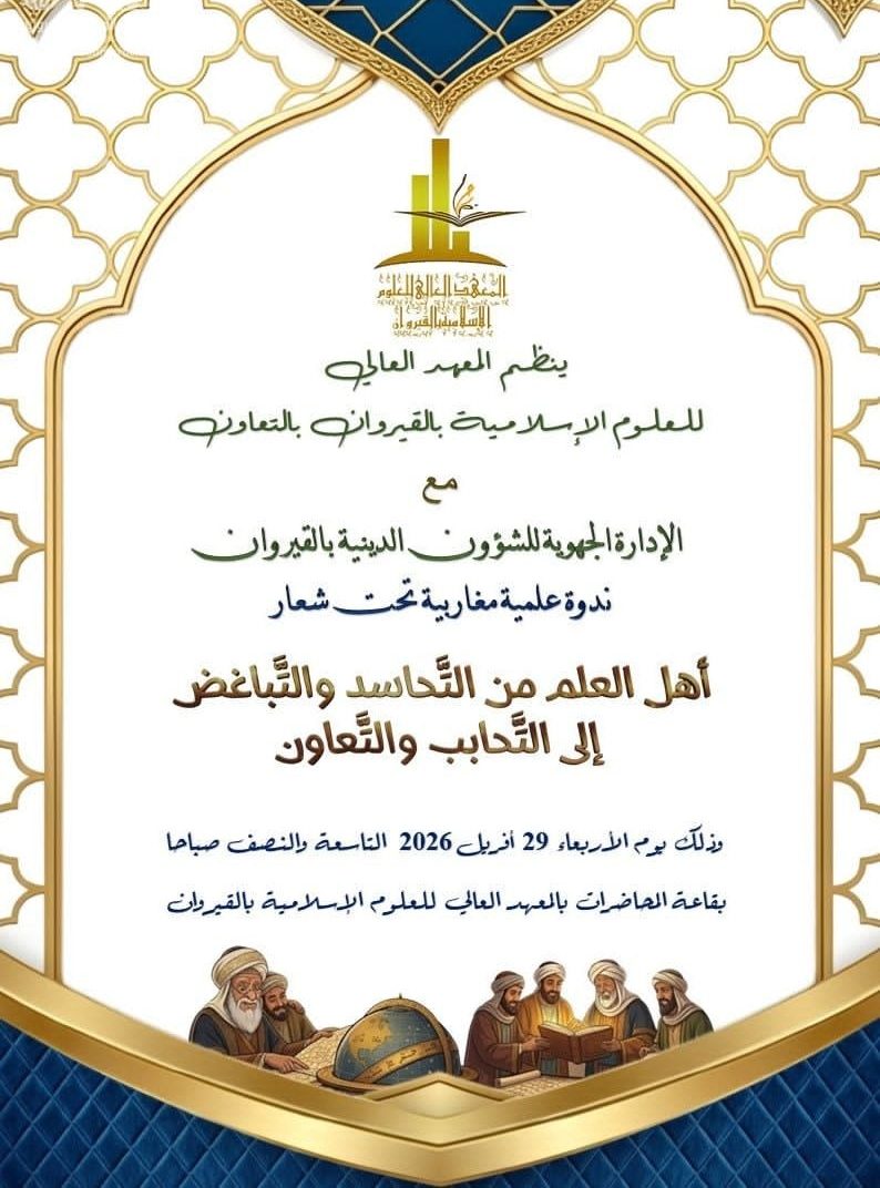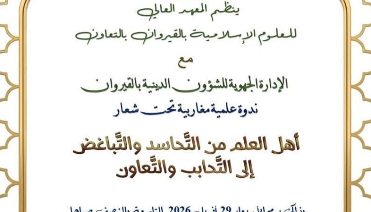 ينظم المعهد العالي للعلوم الإسلامية بالقيروان بالتعاون بالتعاون مع الإدارة الجهوية للشؤون الدينية بالقيروان صباح يوم 29 أفريل الجاري قاعة المحاضرات بالمعهد المنظّم ندوة علمية مغاربية تحت شعار “أهل العلم من التحاسد والتباغض إلى التحابب والتعاون”.