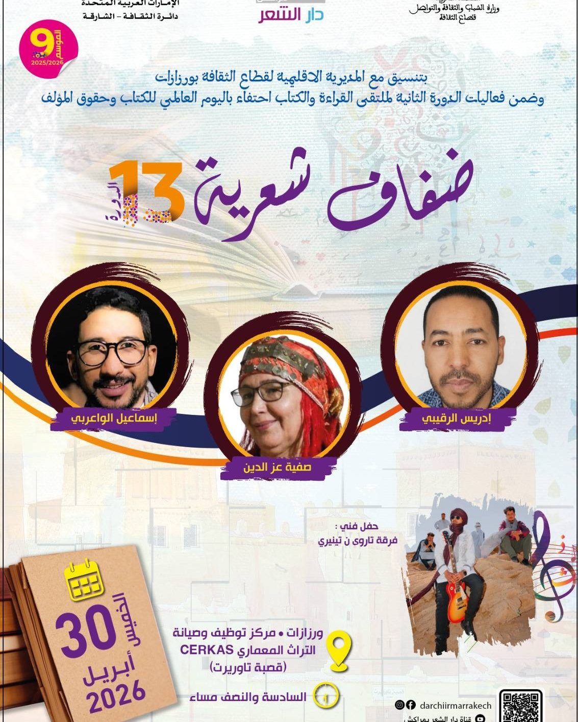 هذه التظاهرة الشعرية والفنية، والتي تواصل من خلالها دار الشعر بمراكش، الانفتاح على باقي مدن وجهات المملكة المغربية جنوبا، من خلال تنظيم برامج تواكب التظاهرات الثقافية والشعرية والانفتاح على أجيال وتجارب وحساسيات الشعر المغربي. وتقدم دار الشعر بمراكش، عصر يوم الخميس 29 أبريل، على الساعة الرابعة والنصف عصرا بفضاء مركز توظيف وصيانة التراث المعماري (قصبة تاوريرت)، تجربتها “تسع سنوات في ترسيخ الفعل القرائي والتحسيس به” ضمن برنامج ندوات، الذي وسم ب “في أفق خطة وطنية جديدة للقراءة”، ضمن عرض تأطيري تشرف الدار على تقديمه الى جانب “تجربة ورشات الكتابة الشعرية لدار الشعر بمراكش” (للأطفال واليافعين والشباب)/ 9 مواسم في محبة الشعر والتحسيس بالقراءة ومحبة الكتاب”. ويشرف الناقد والشاعر الدكتور عبداللطيف السخيري على تقديم ورشة تطبيقية نموذجية حول “الكتاب” موجهة (لفئة اليافعين والشباب وأطر أندية القراءة بالمؤسسات التربوية).