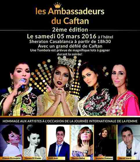 تزامنا مع اليوم العالمي للمرأة تنظم les ambassadeurs évents بشراكة مع luxury by k الدورة الثانية لعرض سفراء القفطان ذلك يوم 05 مارس المقبل، ابتداء من الساعة السادسة مساء بفندق شيراتون بمدينة الدار البيضاء، بمشاركة نخبة من ألمع نجوم الفن والإعلام، الحفل الذي ستنشطه الإعلامية سلمى عماري، سيعرف تكريم العديد من الشخصيات النسائية البارزة والتي طبعت السنة الماضية بحضور قوي، كالصحفية الكبيرة والمتميزة سميرة عثماني، وصاحبة الصوت الرائع والحنجرة الماسية الفنانة دنيا باطمة، فضلا عن الفنانة المقتدرة حياة الإدريسي، وسفيرة الأعمال الخيرية وملكة جمال العرب المغتربات إيمان شاكر، كما سيتم تكريم نجمة الكوميديا المغربية حنان الفاضلي.
