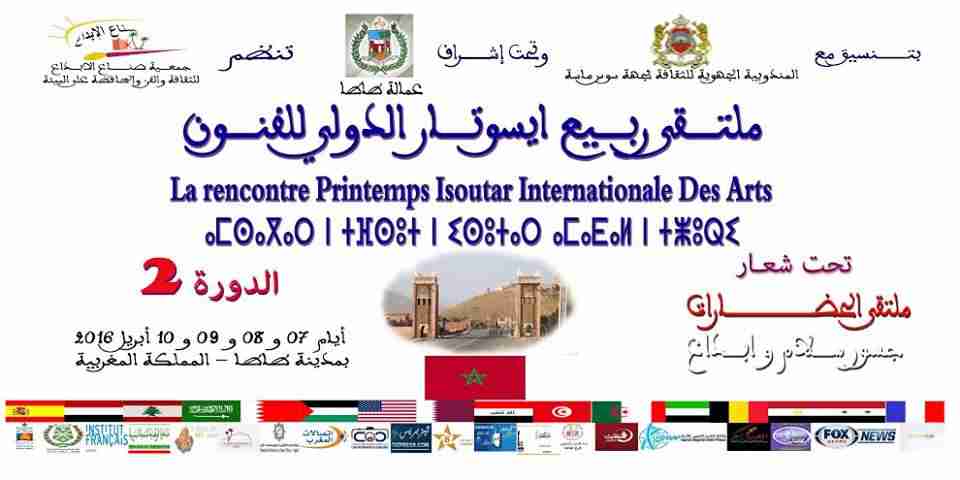 بعد نجاح الدورة الأولى لملتقى “ربيع إيسوتار الدولي للفنون”، تستعد مدينة طاطا لاحتضان الدورة الثانية للملتقى تحت شعار “ملتقى الحضارات : جسور، سـلام، وإبــداع”، وذلك أيام 7ـ 8 ـ 9 و10 أبريل 2016، برعاية جمعية صــناع الإبـداع للثقافة والفن والمحافظة على البيئة، وبمشاركة أكثر من 50 مشاركا من فنانين وكتاب وشعراء من 16 دولة شقيقة وصديقة.