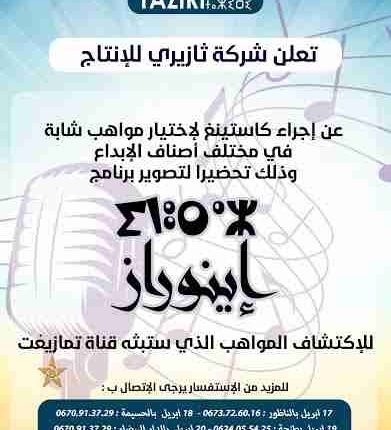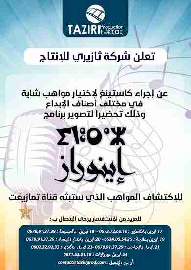 في نشاط مشترك مع شركة TAZIRI PRODUCTION العازمة على تنفيذ إنتاج النسخة الثانية من برنامج المسابقات ” اينوراز” للمواهب. تدعو كل من جمعية ثفسوين للمسرح الامازيغي بالحسيمة و شركة تازيري للإنتاج كافة الشباب الموهوبين في : الكوميديا و الرقص و التشكيل و الموسيقى و الألعاب السحرية و باقي فنون العرض إلى المشاركة ابتداء من الساعة العاشرة صباحا إلى غاية الساعة السادسة مساء في الكاستينغ الذي سينظم حسب البرمجة التالية :