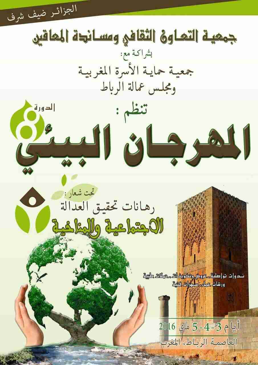 تنظم جمعية التعاون الثقافي و مساندة المعاقين بشراكة مع جمعية حماية الاسرة المغربية، المهرجان البيئي في نسخته الثامنة أيام 3 و 4 و 5 يونيو 2016، حيث استقر الاختيار على العاصمة الرباط كمكان للقمة من طرف اللجنة المنظمة تحت شعار “تحديات العدالة الاجتماعية و المناخية”، التي دأبت على تنظيمه سبع سنوات، آخرها كانت بمدينة ابن جرير سنة 2015.