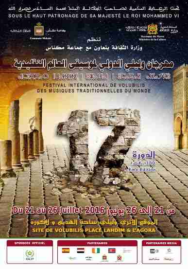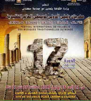تحت الرعاية السامية لصاحب الجلالة الملك محمد السادس نصره الله، تنظم وزارة الثقافة بتعاون مع جماعة مكناس في الفترة المتراوحة ما بين 21 و 26 يوليوز 2016 الدورة السابعة عشرة لمهرجان وليلي الدولي لموسيقى العالم التقليدية.
