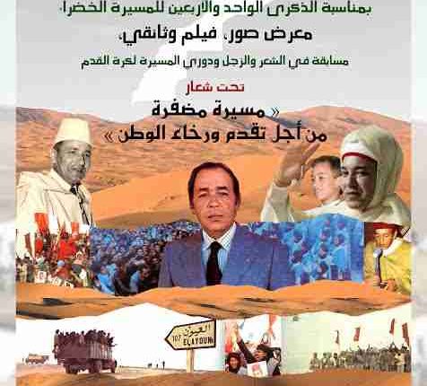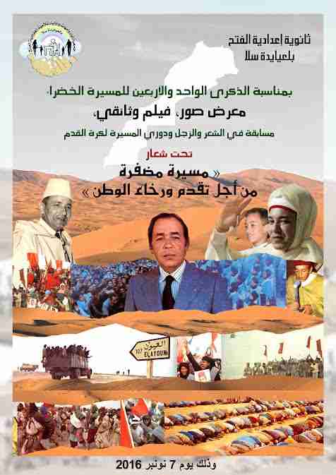 تنظم جمعية أباء وأمهات وأولياء ثانوية إعدادية الفتح بالعيايدة بمدينة سلا بتنسيق مع إدارة المؤسسة، فعاليات ثقافية بمناسبة الذكرى الواحدة والأربعين للمسيرة الخضراء، تحت شعار “مسيرة مضفرة من أجل تقدم ورخاء الوطن”، تتضمن معرضا للصور وشريط وثائقي حول المناسبة، بالإضافة إلى مسابقة في الشعر والزجل مخصصة لتلاميذ المؤسسة. وعلى هامش هذه الأنشطة الثقافية سيتم تنظيم دوري في كرة القدم.
