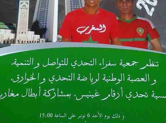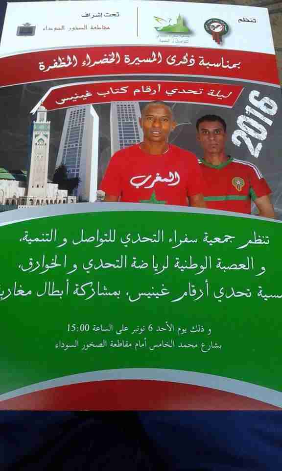 بمناسبة ذكرى المسيرة الخضراء المظفرة ، ستننظم جمعية سفراء التحدي للتواصل والتنمية بمدينة الدار البيضاء بتنسيق مع العصبة الوطنية لرياضة التحدي والخوارق وجمعية المعهد العالي للكونغ فو شاولين تشوان والتشي كونغ والرياضات المشابهة ببومالن دادس ، تحت اشراف عامل صاحب الجلالة على عمالة عين السبع الحي المحمدي ـ والي أمن ولاية الدار البيضاء ورئيس مقاطعة الصخور السوداء أمسية بيضاوية ” ليلة تحدي أرقام غنيز 2016 “وذلك يومي السبت والاحد 05 ـ06 نونبر2016 بشارع محمد الخامس امام مقاطعة الصخور السوداء وفق البرنامج الاتي :
