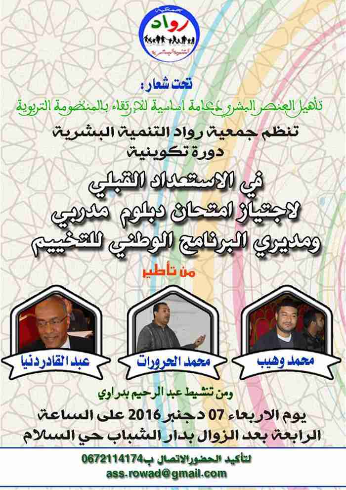 تنظم جمعية رواد التنمية البشرية دورة تكوينية للإعداد القبلي لاجتياز امتحان دبلوم مدربي ومديري البرنامج الوطني للتخييم