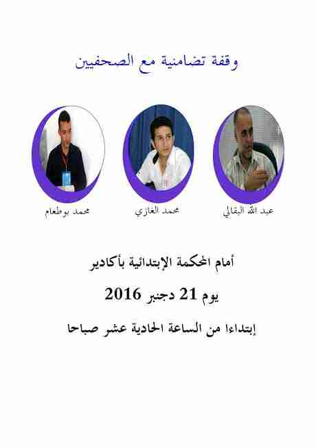 ينظم الفرع الجهوي للنقابة الوطنية للصحافة المغربية وقفة احتجاجية يوم الأربعاء 21 دجنبر 2016 على الساعة الثانية عشر زوالا امام المحكمة الابتدائية باكادير.