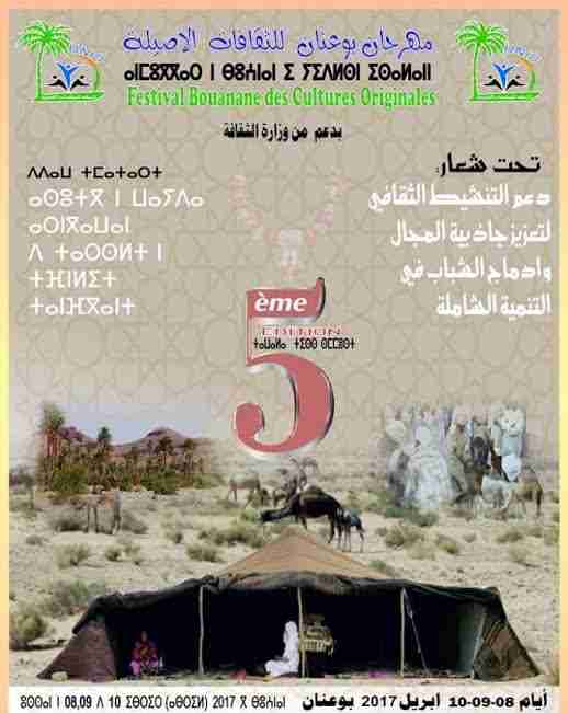 ينظم اتحاد المبادرات التنموية بجماعة بوعنان-إقليم فكيك(المغرب)، بدعم من وزارة الثقافة والمعهد الملكي للثقافة الأمازيغية والمبادرة الوطنية للتنمية البشرية، ووكالة تنمية أقاليم الشرق، والمجلس الإقليمي لفجيج، والجماعة الترابية لبوعنان، الدورة الخامسة لـ «مهرجان بوعنان للثقافات الأصيلة «من 08 أبريل المقبل إلى غاية 10 منه، تحت شعار: “دعم التنشيط الثقافي لتعزيز جاذبية المجال وإدماج الشباب في التنمية الشاملة” بفضاءات جماعة بوعنان-إقليم فكيك.