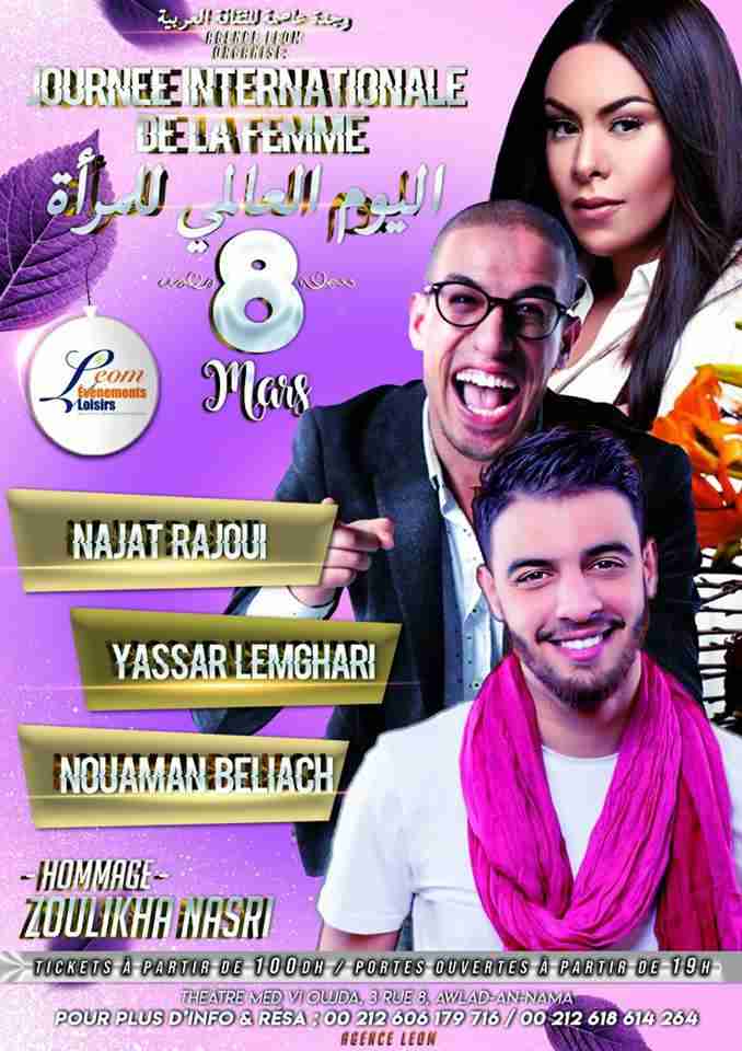 في إطار الاحتفاء السنوي باليوم العالمي للمرأة الذي يصادف 8 مارس من كل سنة تنظم وكالة leomبمسرح محمد السادس بمدينة وجدة امسيرة فنية و ذلك يوم الخميس 8 مارس 2018 .