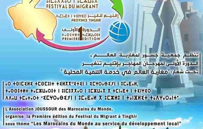 تعتزم جمعية جسور لمغاربة العالم تنظيم مهرجان المهاجر النسخة الأولى بإقليم تنغير ,تحت شعار ” مغاربة العالم في خدمة التنمية المحلية ” وذلك أيام 10/11/12 غشت المقبل , و تأتي هذه المبادرة الأولى من نوعها على الصعيد الوطني في إطار جهود الجمعية لخلق و تقوية جسور التواصل و الارتباط بين مغاربة العالم و بلدهم الأم المغرب , و لتعريف الأجيال الصاعدة منهم بالمؤهلات الثقافية و الاقتصادية للوطن ,و تعزيزا لمشاعر الانتماء للوطن و مقدساته , و هي تظاهرة يرى القائمون عليها في إدارة المهرجان أنها فرصة لتشجيع أبناء الجالية على الاستثمار في المغرب , و تعريفهم بمجموعة من القضايا التي هم مطالبون بتمثيل وطنهم فيها على أحسن وجه كقضية الوحدة الترابية للمملكة و محاربة كل أشكال الغلو و التطرف , حيث يتبوأ المغرب تحت القيادة الرشيدة لصاحب الجلالة مكانة رائدة .