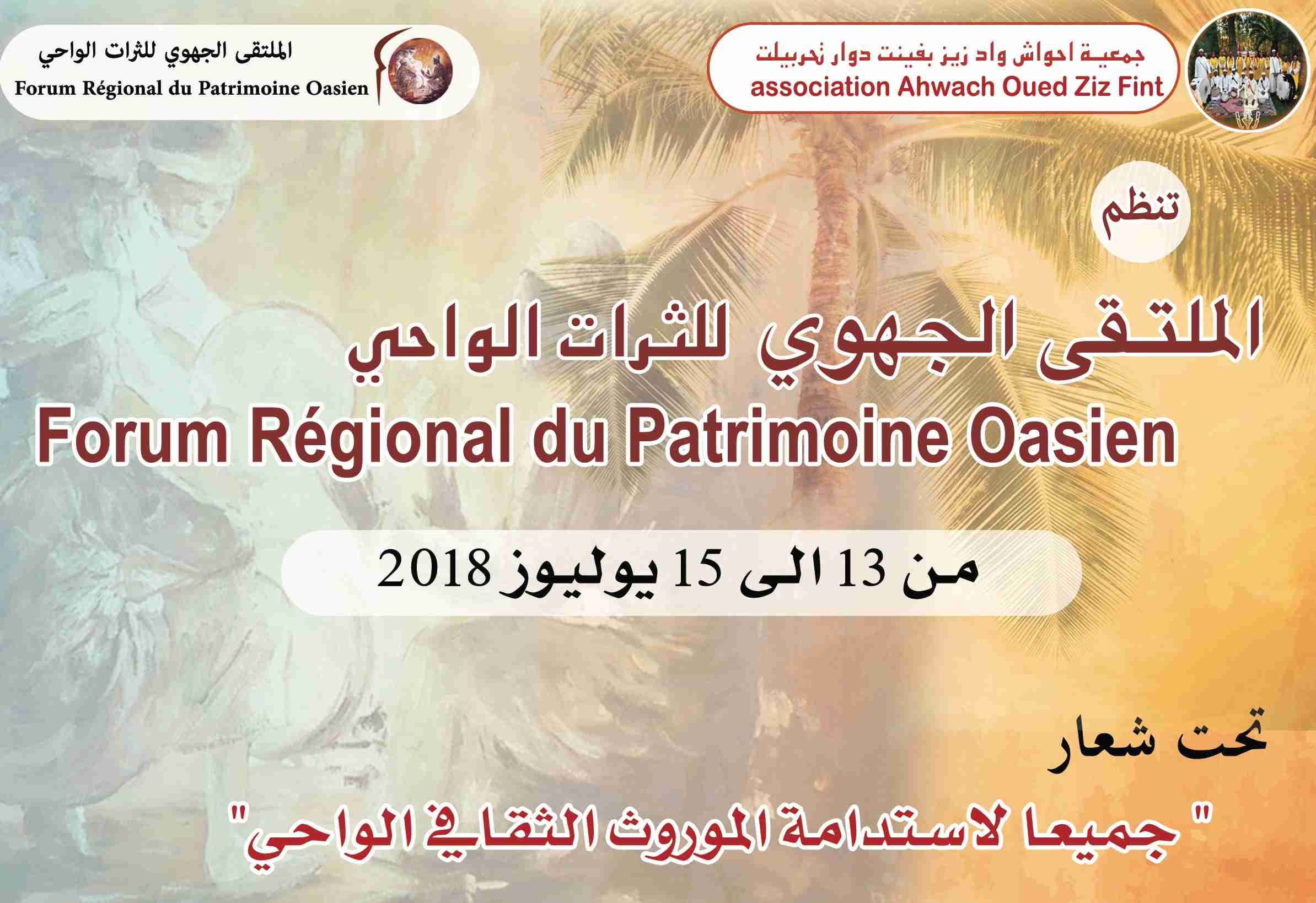 الملتقى الجهوي للتراث الواحي في نسخته الأولى تحت شعار ” جميعا لإستدامة الموروث الثقافي الواحي”وذلك ايّام 13-14-15 يوليوز 2018