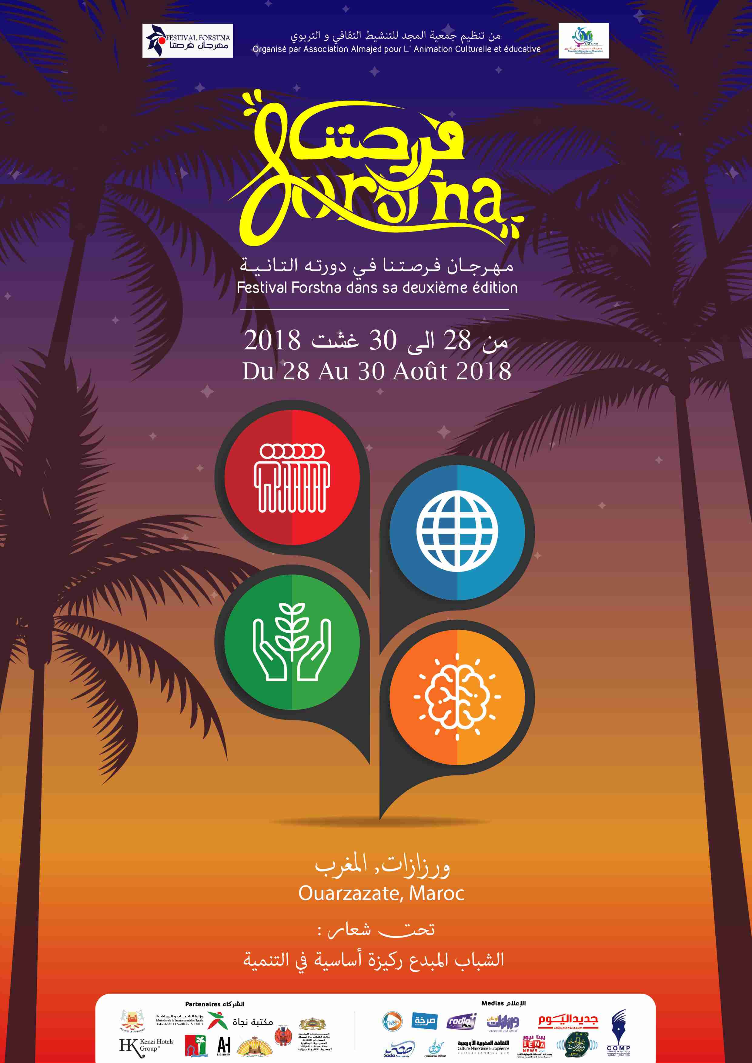 تحت شعار ” الشباب المبدع ركيزة أساسية في التنمية”، تنظم جمعية المجد للتنشيط الثقافي والتربوي بورزازات بدعم من المجلس الجماعي لمدينة ورزازات و عمالة إقليم ورزازات و المجلس الاقليمي لورزازات و المديرية الاقليمية لوزارة الثقافة الاتصال بورزازات و شركاء اخرون، الدورة الثانية لمهرجان “فرصتنا”.