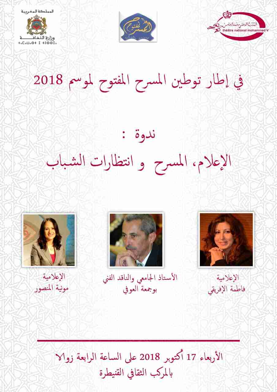 في إطار برنامجها الثقافي للتوطين المسرحي، وبدعم من " وزارة الثقافة والاتصال - قطاع الثقافة "، وبتعاون مع " المسرح الوطني محمد الخامس " و " المركز الثقافي " بالقنيطرة، تنظم فرقة " المسرح المفتوح " ندوة فكرية حول موضوع : " الإعلام والمسرح وانتظارات الشباب " بمشاركة : الإعلامية " فاطمة الإفريقي "، الشاعر والناقد الفني " بوجمعة العوفي " والإعلامية " مونية المنصور ". وذلك يوم الأربعاء 17 أكتوبر 2018 بالمركز الثقافي بالقنيطرة، على الساعة الرابعة بعد الزوال