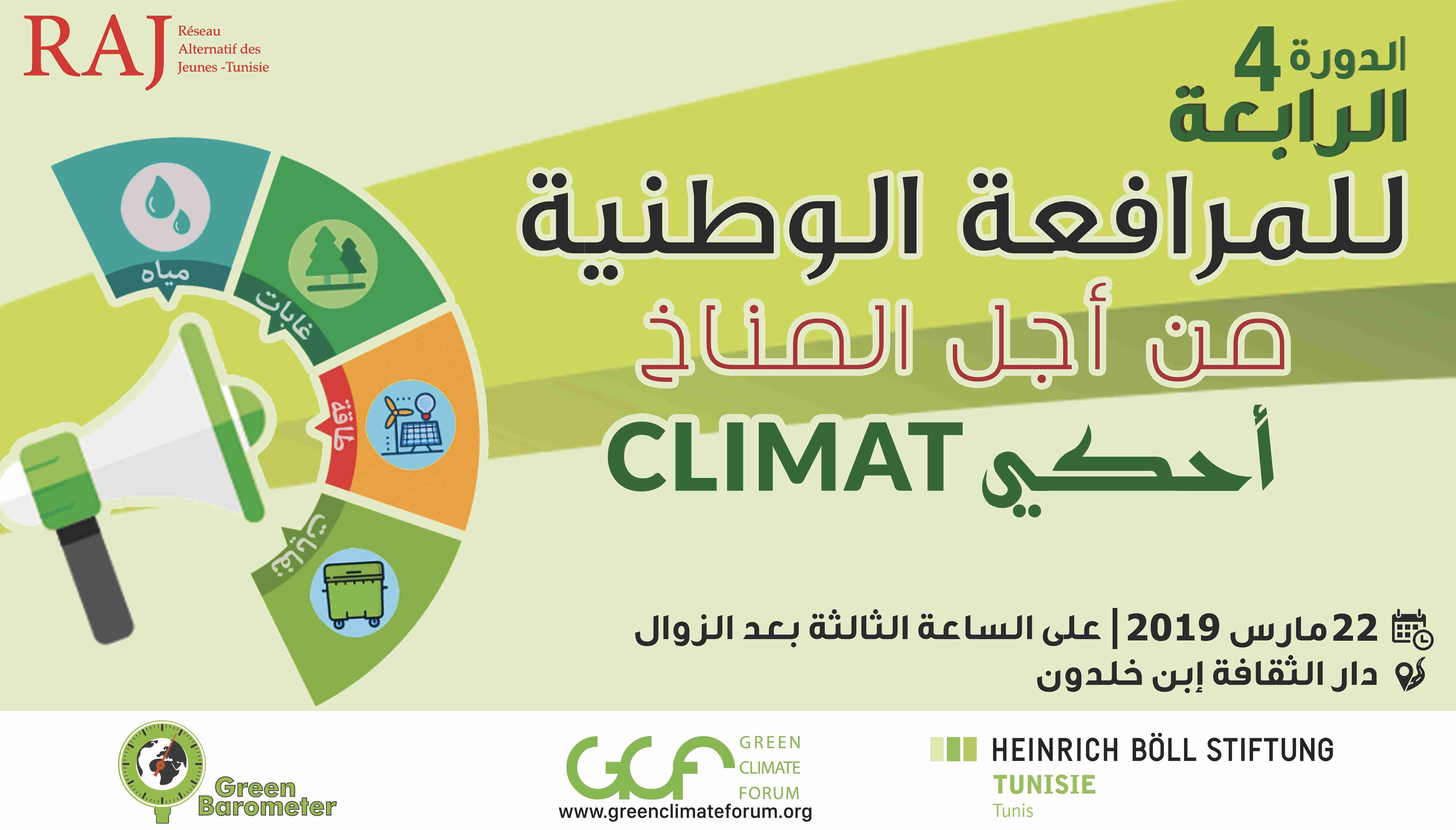 تنظم منظمة راج تونس بالتعاون مع المنظمة الألمانية هنريش بول – تونس الدورة الرابعة للمرافعة الوطنية من أجل المناخ وذلك يوم الجمعة22 مارس 2019 على الساعة الثالثة بعد الزوال بفضاء دار الثقافة بن خلدون.