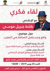 اللقاء الذي سيحتضنه المقهى الثقافي لفندق أمال بمدينة سيدي يحيى الغرب، في الرابعة من مساء يوم الاحد 24 نونبر 2019، سيشارك فيه كل من الاستاذ بوعزة الخلقي بمداخلة حول: “القيم والاعلام: قراءة في تجربة طلحة جبريل” والاستاذ يحيى عمران بمداخلة حول: “الاخبار الزائفة ومواقع التواصل الاجتماعي عند طلحة جبريل”.