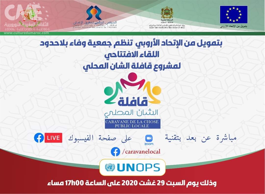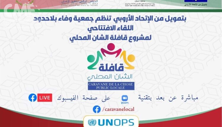 تنظم جمعية وفاء بلاحدود مشروع قافلة تدبير الشأن المحلي المنجز بتعاون وبتمويل من الاتحاد الأوروبي وشراكة مع الوزارة المكلفة بالعلاقات مع البرلمان والمجتمع المدني والمجلس الوطني لحقوق الإنسان برعاية UNOPS.